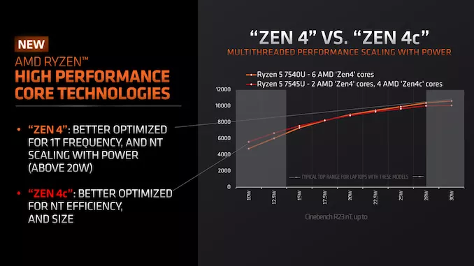 Они свидетельствуют о том, что «полнофункциональные» ядра Zen 4 лучше справляются с «тяжелыми» нагрузками и наиболее эффективно работают при высоких частотах и потреблении более 20 Вт энергии. Компактные же ядра наиболее эффективны при более низких частотах и обеспечивают существенную экономию энергии при сохранении достаточно высокой вычислительной мощности.