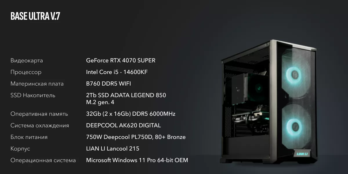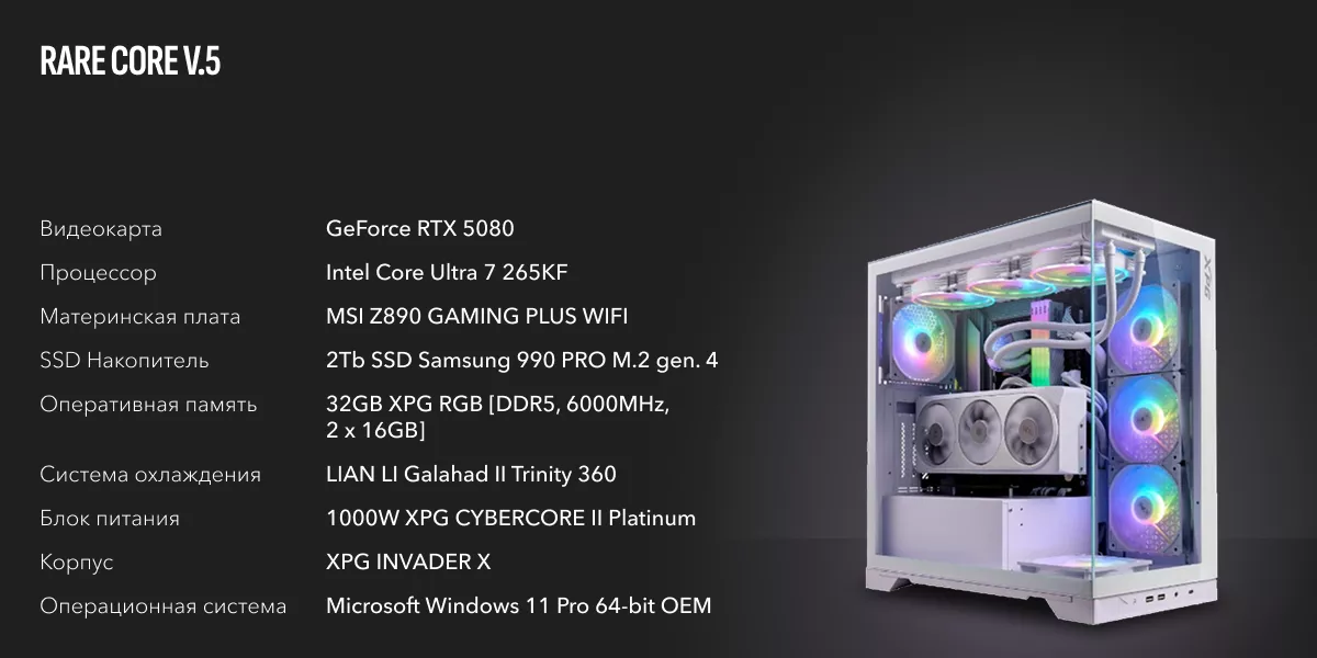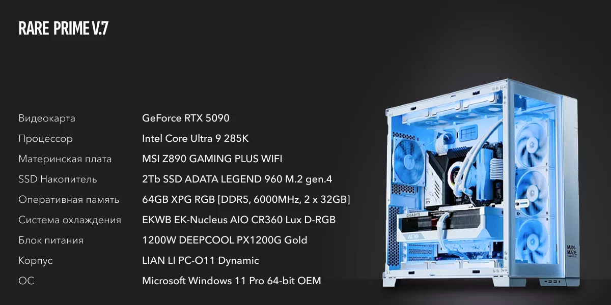 ПК оснащен процессором Core Ultra 9 285K, который является флагманом нового поколения процессоров Intel. Он имеет 8 производительных ядер с частотой до 5.7 ГГц и 16 энергоэффективных ядер с частотой до 4.6 ГГц. Кэш L3 составляет 36 МБ. Этот процессор обеспечивает отличную производительность в играх, многозадачности и ресурсоемких приложениях.