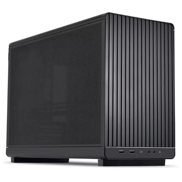 Для уменьшения габаритов компьютерного корпуса было решено переместить отсек для БП в переднюю часть. Несмотря на то, что панель спереди не имеет отверстий, корпус за счет небольшого объема можно продуть насквозь, для этого имеются посадочные места для трех вентиляторов сверху и снизу. Также при желании можно установить дополнительные вентиляторы на боковую крышку для лучшего обдува материнской платы. Если вам не нравится перфорированная стенка, то Lian Li может предложить стенку из закаленного стекла в качестве отдельного аксессуара.