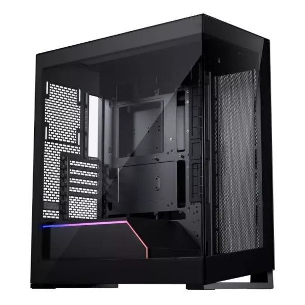 Корпус PHANTEKS 523 XT Pro Ultra для ПК имеет перфорированную переднюю панель, а также пылевой фильтр на магнитах под ней. Верхний фильтр также легко снимается и чистится. Несмотря на мощный поток воздуха внутрь корпуса, пыль практически не скапливается. Что примечательно, корпус поддерживает новомодные материнские платы со скрытым подключением кабелей. Для улучшения внешнего вида доступна переходная рамка, позволяющая установить видеокарту вертикально.