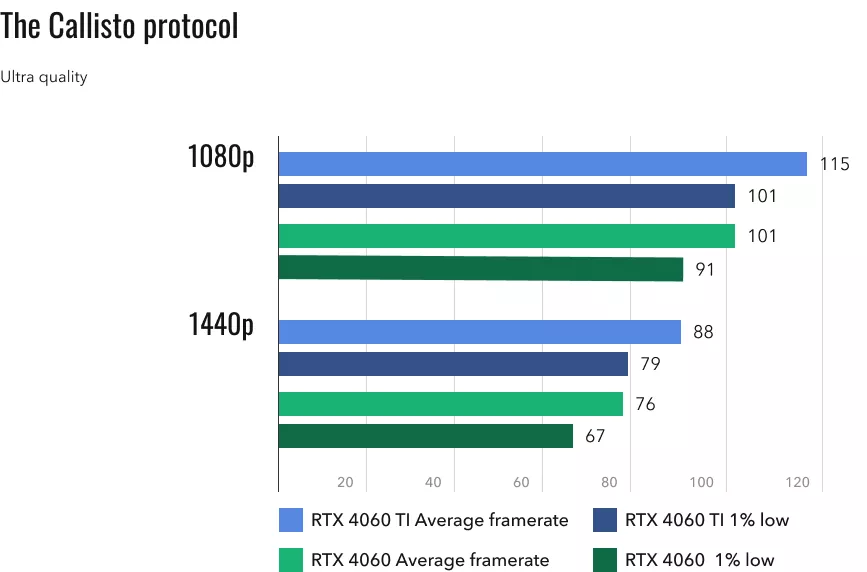 При рассмотрении результатов игры The Callisto Protocol можно отметить достаточно интересные показатели, так как разница результатов RTX 4060 и RTX 4060 Ti составляет всего 14% в 1080р и 16% в 2К. То есть оба адаптера демонстрируют практически одинаковые показатели. Это связано с особенностями движка игры, который предъявляет высокие требования к пропускной системе памяти. По сути, игровой бенчмарк продемонстрировал именно разницу в скорости работы подсистемы памяти RTX 4060 и RTX 4060 Ti. Несмотря на близкие показатели, оба адаптера позволят с комфортом поиграть как в 1080р, так и в 2К.