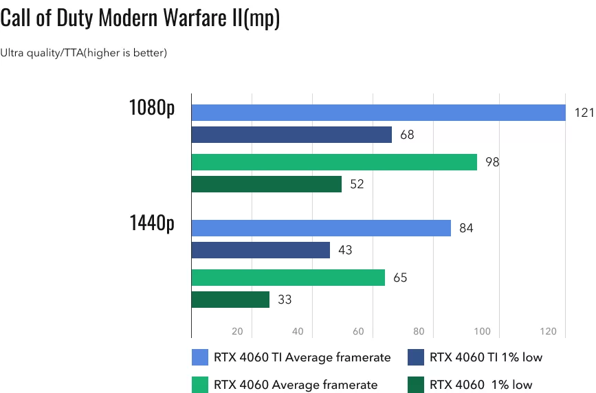 В Call of Duty MW II результаты тестирования показывают практически такие же результаты, с разницей между GeForce RTX 4060 и RTX 4060 Ti в 23%, в разрешении 1080р и увеличившимся до 29% отрывом в 2К.