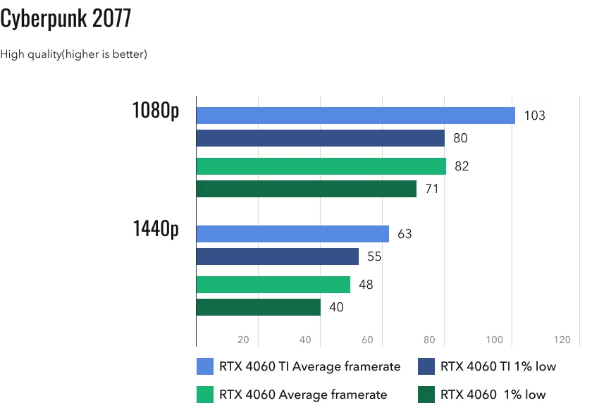 Начнем тестирование с игры Cyberpunk 2077, в которой разница производительности между RTX 4060 и RTX 4060 Ti в разрешении 1080р составляет 26%, а в 2К она увеличивается до 31%, что явно обусловлено более быстрой подсистемой памяти у RTX 4060 Ti.