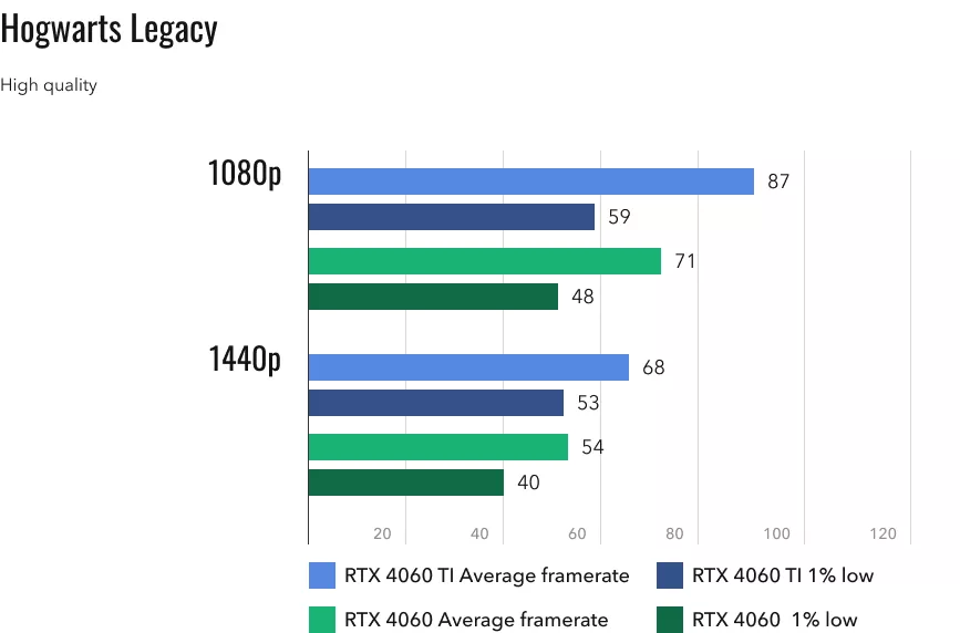 Показатели RTX 4060 и RTX 4060 Ti в Hogwarts Legacy в целом типичные и демонстрируют разницу 22% при разрешении 1080р и возрастание разрыва производительности до 26% при переходе к 2К.