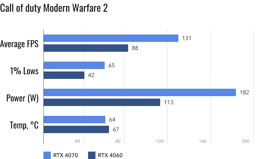 В динамичном шутере фреймрейт играет особую роль, поэтому здесь превосходство RTX 4070 как нельзя кстати – видеокарта выдает средний FPS в размере 131 кадра в секунду. Увы, RTX 4060 в этой активной игре показывает значительное отставание – 88 кадров в секунду. Аналогичная история и с параметром 1% Lows – 65 и 42 FPS в секунду. При этом RTX 4060 нагрелась на 3 градуса сильнее.