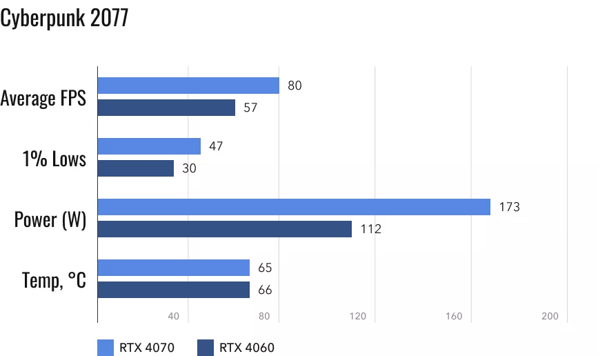 Серьезное доминирование RTX 4070 над младшим соперником продолжается в нашумевшей игре Cyberpunk 2077. Здесь более производительная версия демонстрирует 80 кадров в секунду, тогда как RTX 4060 выдает средние 57 кадров. Параметр 1% Lows – 47 и 30 кадров соответственно, и оба этих показателя нельзя назвать отличными. Нагревается RTX 4060 по-прежнему немного сильнее.