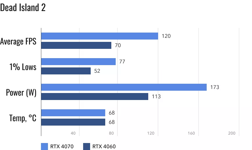 Бенчмарк в зомби-шутере Dead Island 2 с видеокартой RTX 4070 завершается с цифрами 120 FPS на счетчике среднего фреймрейта. На целых 50 кадров позади стоит RTX 4060 – выдает всего 70 FPS. С минимумами 1% у младшей модели тоже все не так радужно – 52 кадра против 77 у старшей RTX 4070. Несмотря на меньшее энергопотребление, RTX 4060 нагрелась до аналогичных 68 градусов.