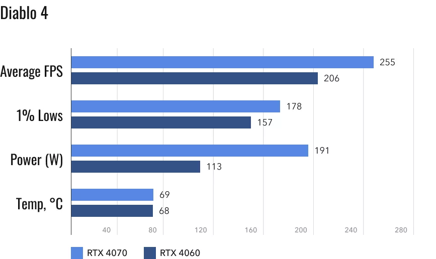 В игре Diablo 4 обе карты показывают отличную производительность, но превосходство явно за RTX 4070 – средний фреймрейт составляет 255 кадров в секунду против 206 кадров у младшей модели. Чуть меньший разрыв наблюдается по параметру 1% Lows – 178 кадров в секунду против 157. При этом обе видеокарты нагрелись в игре практически одинаково – RTX 4060 всего на градус холоднее.