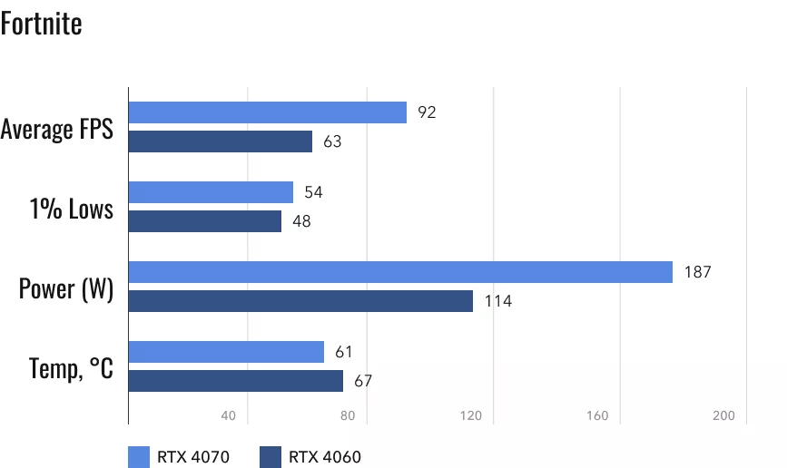 Средний FPS в игре Fortnite с видеокартой RTX 4070 – 92 кадра в секунду, тогда как RTX 4060 почти опустилась до минимальной комфортной отметки – 63 FPS. Минимумы в 1% различаются не так уж сильно и оба лежат ниже 60 кадров в секунду: у RTX 4070 это 54 кадра, у RTX 4060 – 48 кадров. При этом, несмотря на меньшее энергопотребление, младшая версия нагрелась на 6 градусов сильнее.