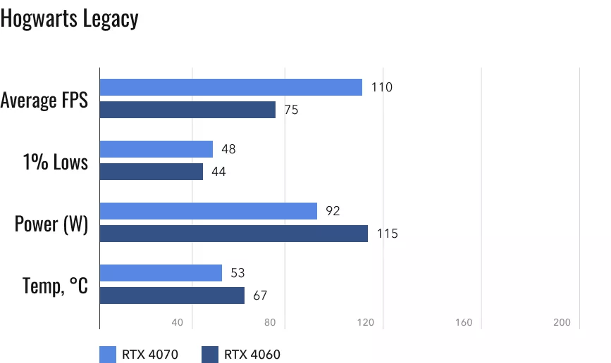 На максимальных настройках графики Hogwarts Legacy играется на RTX 4070 более чем комфортно, так как средний фреймрейт достигает 110 кадров в секунду. Без особого дискомфорта можно играть и на RTX 4060, которая демонстрирует производительность в 75 кадров в секунду. Однако греется она на 14 градусов сильнее, и потребляет тоже – результаты для многих оказались неожиданными.