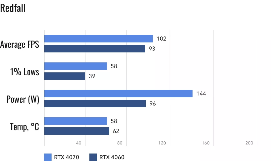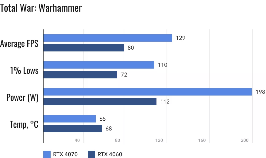 В отличие от прошлых двух игр, здесь результаты тестирования вполне очевидные как по среднему FPS, так и по 1% Lows. Видеокарта NVIDIA GeForce RTX 4070 демонстрирует в обеих номинациях 129 и 110 кадров в секунду соответственно, а NVIDIA GeForce RTX 4060 – 80 и 72 кадра в секунду. Нагрев у последней, к слову, снова больше, хотя потребление электроэнергии вышло на 86 Ватт меньше.