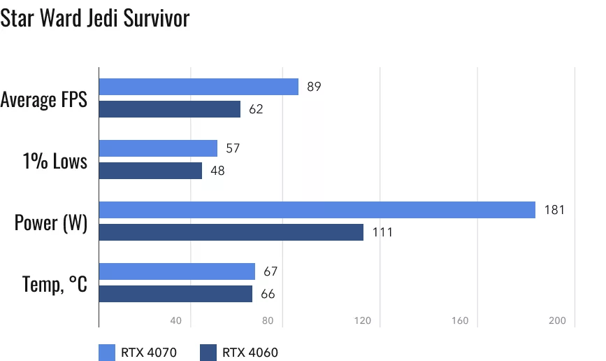 При практически одинаковом нагреве видеокарты RTX 4070 и RTX 4060 выдали в «Звездных войнах» 89 и 62 кадра в секунду соответственно, если рассматривать показатель среднего фреймрейта. Что касается минимумов 1%, показатели следующие – 57 FPS у RTX 4070 и 48 FPS у младшей модели. По-прежнему старшая версия сохраняет серьезное преимущество и дарит комфортный геймплей.