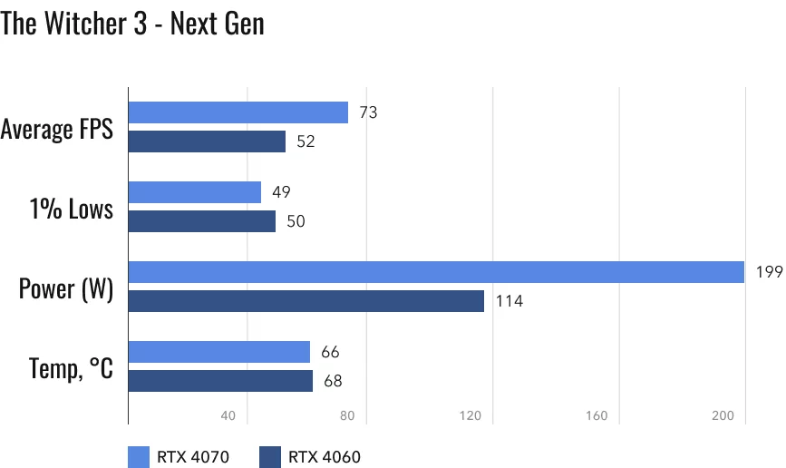 В The Witcher 3 видеокарта NVIDIA GeForce RTX 4070 все еще может обеспечивать комфортный геймплей при среднем фреймрейте в 73 кадра в секунду. Совсем другое дело – RTX 4060, которая не смогла показать больше 52 FPS во время тестирования. Интересно, что 1% Lows младшая модель прошла лучше, чем старший соперник – 50 и 49 кадров в секунду соответственно.