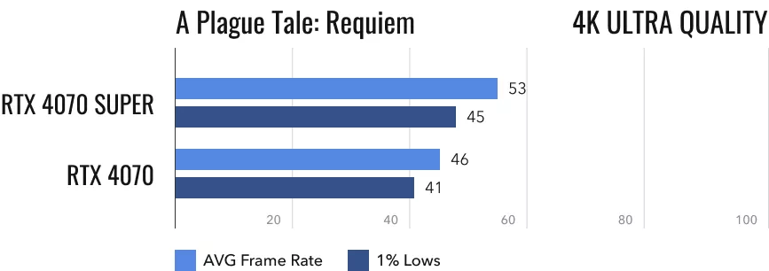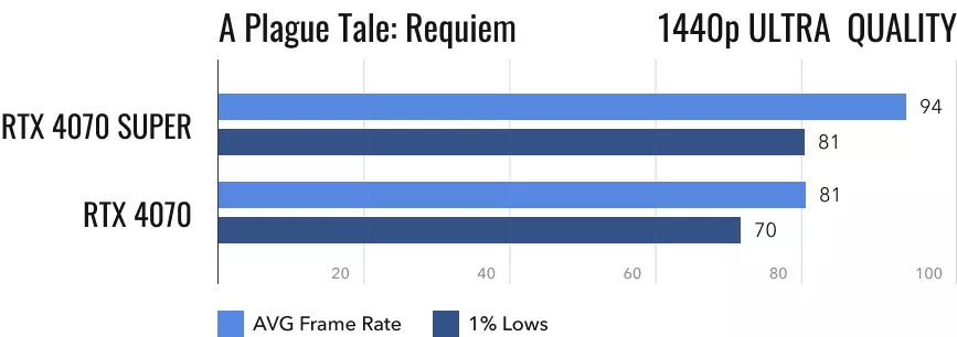 A Plague Tale: Requiem на максимальных настройках, разрешение 1440p: обе видеокарты чувствуют себя прекрасно. Не особо напрягаясь, в среднем они выдают 80 кадров/с. RTX 4070 Super прогнозируемо выдает на 16% более высокий результат.
