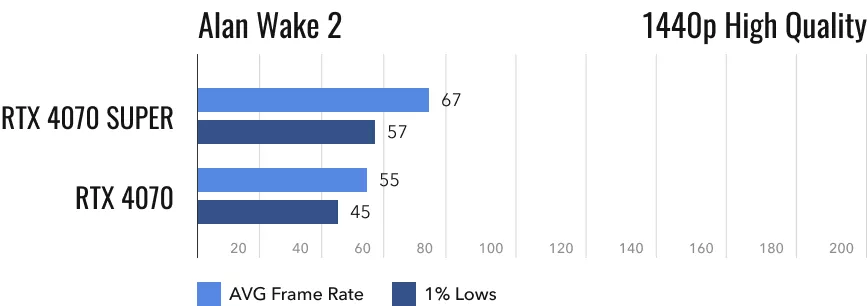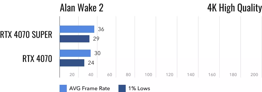 Напоследок пройдемся по самым свежим играм. Значения fps в них у RTX 4070 и RTX 4070 Super оказываются наименее впечатляющими. Впрочем, неспроста, ведь Alan Wake 2 признана одной из самых красивых игр последних лет. Любая видеокарта испытывает с ней проблемы. Это тот случай, когда можно даже не пробовать подключать прошлогоднюю RTX 4070 к 4K-монитору. При столь высоком разрешении и максимальных настройках графики она в среднем выдаст 30 кадров/с, регулярно будут случаться просадки до ещё меньшего значения. Обычная RTX 4070 в этой игре не вытягивает 60 fps даже при разрешении 2K. Её обладателям придётся снижать уровень графики или активировать пресловутый DLSS. Что касается потенциальных покупателей RTX 4070 Super, то они могут наслаждаться разрешением 1440p по полной программе. По крайней мере, те из них, что согласны наблюдать 60 fps. Превосходство RTX 4070 Super над обычной RTX 4070 составляет около 22%.