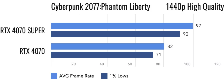 Многих интересуют результаты видеокарт NVIDIA в Cyberpunk 2077. Насыщенная световыми эффектами и открытым миром игра нагружает видеокарты по полной программе. Но и в ней на максимальных настройках с разрешением 1440p RTX 4070 Super выдает вполне приличные 97 fps. Что касается прошлогодней видеокарты, то она выдаёт на 18% меньше кадров. Что, впрочем, не мешает комфортной игре.