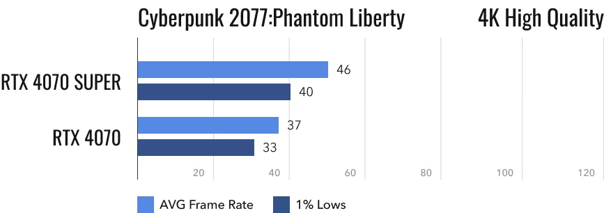 А что происходит при переключении на разрешение 4K? Сильное падение производительности, почти в два раза. До заветных 60 fps не добирается даже свежая RTX 4070 Super. Ещё хуже себя показывает прошлогодняя RTX 4070. Разница в производительности - 15%.