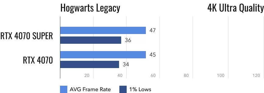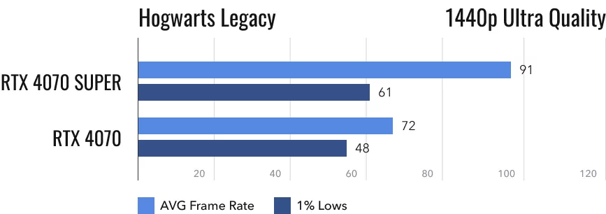 Hogwarts Legacy позволяет окунуться в мир Гарри Поттера. Эту игру ругают за унылый сюжет и некоторые другие недостатки. Но её графика не даёт отрывать от себя глаз, особенно если в компьютере стоит RTX 4070 Super или хотя бы обычная RTX 4070. Первая видеокарта в 2К показывает около 91 fps. Результат второй — на 26% хуже. И это единственная игра, где разница настолько велика. Интересно, что при переключении на 4K-разрешение она стирается: в нём видеокарты RTX 4070 и RTX 4070 Super выдают 45-47 кадров/с, а временами случаются просадки и до совсем низких значений.