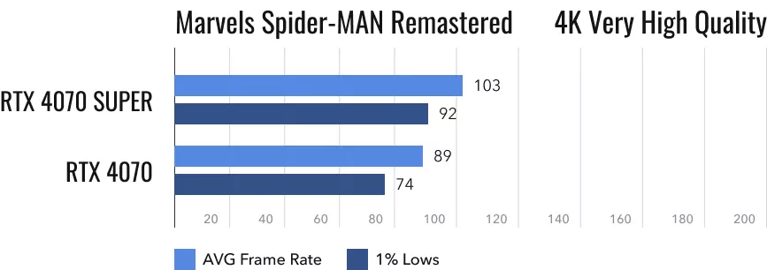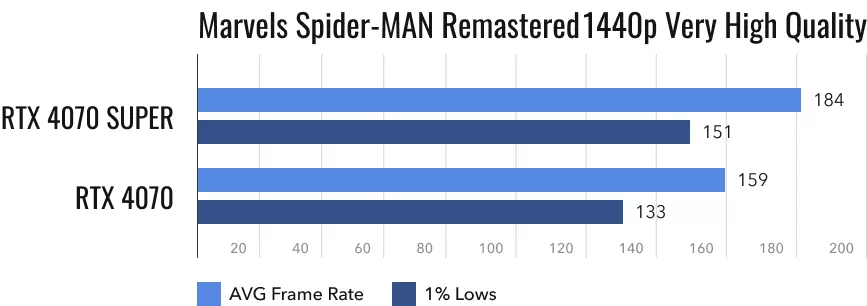 Переходим к бывшим эксклюзивам Sony PlayStation. Они оптимизированы под ПК с их видеокартами не лучшим образом. Однако с «Человеком-Пауком» RTX 4070 и RTX 4070 Super справляются весьма недурно. Особенно если остановиться на 2K-разрешении. В этом случае даже максимальные настройки не заставят ни одну из видеокарт сильно напрягаться. Полностью удовлетворены останутся даже владельцы мониторов с частотой обновления 144 Гц. При этом RTX 4070 показывает себя на 16% хуже более свежей видеокарты. Но на глаз разница при столь высоких значениях fps и вовсе не чувствуется.