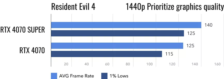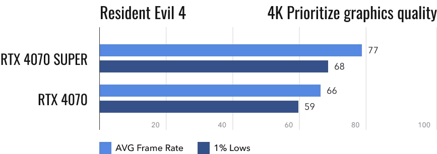 Переходим к Resident Evil 4. Игра от Capcom грамотно оптимизирована, поэтому от неё ожидаешь получить наилучшие результаты. С ней уже хочется обзавестись монитором, экран которого обновляется 144 раза в секунду, так как RTX 4070 Super в 2K-разрешении показывает близкий к этому результат. И это при максимальных настройках. Не снижать их можно и при активации 4K-разрешения, так как в среднем вас ждут приемлемые для многих 77 fps. К слову, барьер в 60 кадров/с превышает и обычная RTX 4070. Эта видеокарта будто бы создавалась именно для таких игр. При разрешении 1440p значения fps у обоих устройств настолько высоки, что некоторые геймеры не заметят разницу. В цифрах же она составляет 12%.