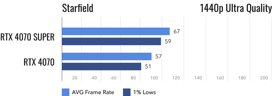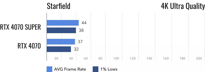 Наконец, Starfield. Не лучшая игра, однако она отлично показывает себя в качестве бенчмарка. Обычной RTX 4070 приходится весьма туго. Даже в разрешении 1440p она не готова выдать заветные 60 кадров/с. Её последователь переступил через эту черту, и уверенно — новинка превосходит видеокарту 2023 года на 17,5%. В 4K-разрешении превосходство RTX 4070 Super составляет 19%, но обе видеокарты на максимальных настройках выдают очень низкий fps, поэтому желающим поиграть в 4К придется снизить настройки графики.