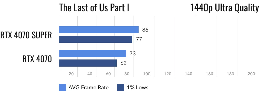 А что по поводу разрешения 1440p? В нём The Last of Us уже не заставляет думать о замене видеокарты на ещё более мощное решение. Даже RTX 4070 выдаёт адекватные 73 fps с редкими просадками до 62 fps. Результат RTX 4070 Super — на 18% лучше.