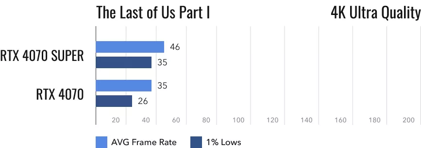 В ожидании портирования второй части «Одних из нас» владельцы ПК играют в первую. Не нужно напоминать о том, как игра вела себя в первые месяцы после релиза. Сейчас, впрочем, ситуация изменилась не сильно. RTX 4070 и RTX 4070 Super едва выжимают из неё сколь-либо адекватные значения. О 4K на ультра-настройках графики можно даже не заикаться, ведь редкий обладатель ПК согласится играть на значениях 35-45 fps. Особенно если он будет знать, что оригинал игры вышел ещё на PlayStation 3. Отчасти спасает ситуацию DLSS 3. Но работа этой технологии нравится не всем.
