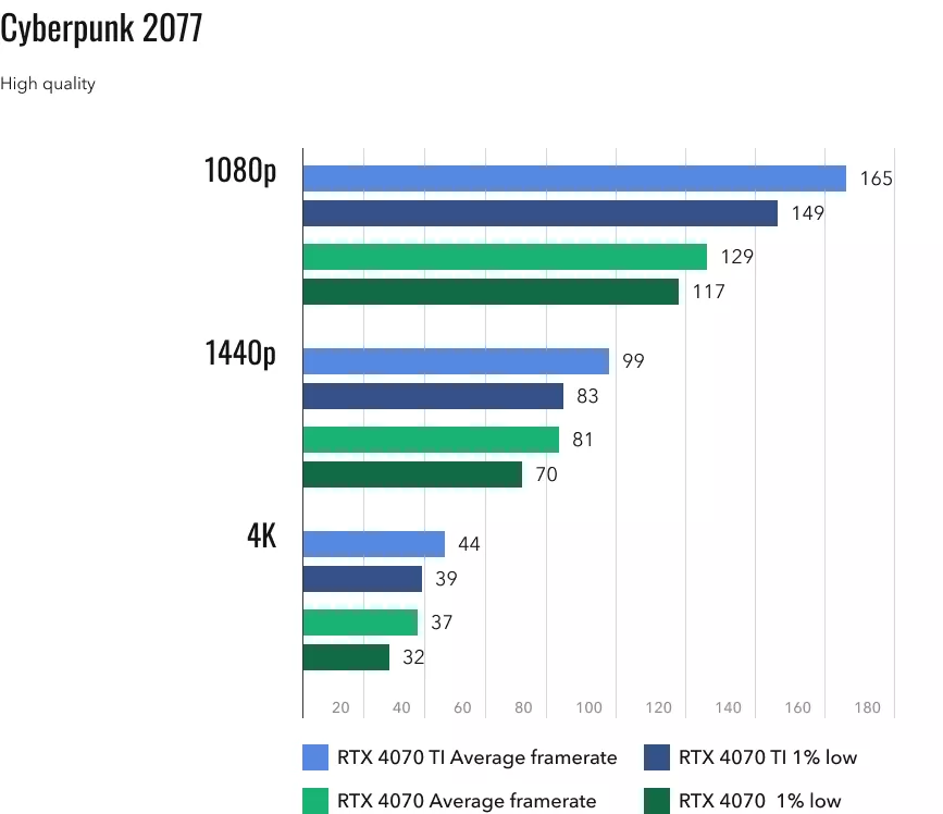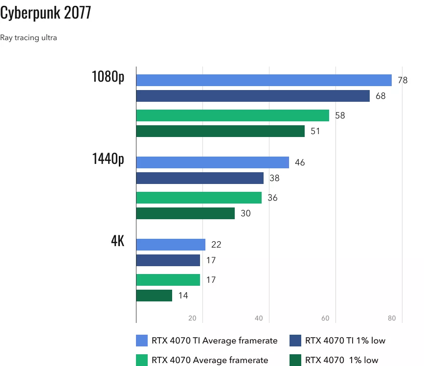 Ситуация меняется при активации в Cyberpunk 2077 трассировки лучей, после чего производительность RTX 4070 и RTX 4070 Ti существенно «проседает» и достижение базовых 60 ФПС становится реальным только для RTX 4070 Ti и только в 1080р, во всех остальных режимах обе видеокарты не способны обеспечить комфортный уровень производительности.