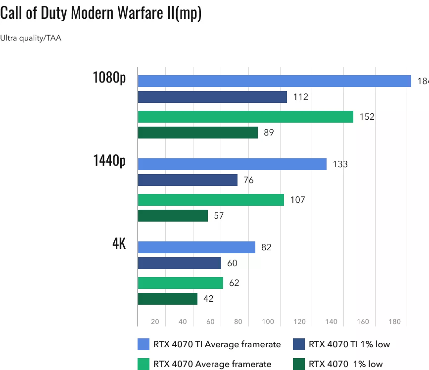 В Call of Duty MW 2 обе видеокарты обеспечивают отличную кадровую частоту в разрешении вплоть до 2К. При переходе в 4К с игровым движком на хорошем уровне справляется только RTX 4070 Ti, а RTX 4070 не способна обеспечить стабильные 60 FPS в нативном разрешении. В целом разница производительности между обеими видеокартами в FullHD и 2K составляет около 20-25%.