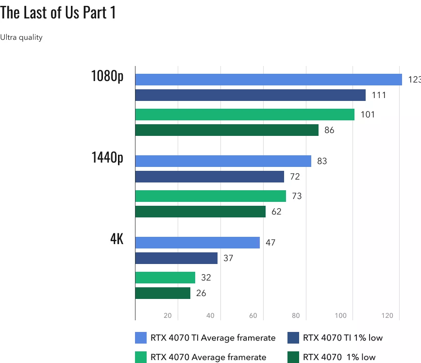 Еще меньшая разница между RTX 4070 и RTX 4070 Ti наблюдается в игре The Last of Us Part I. Обе карты обеспечивают плавный геймплей в 2К (выше 60 FPS), при этом разница в кадровой частоте составляет всего 14%. Хотя она увеличивается до 34% при переходе в 4К, но большой ценности этот результат не представляет, так как обе карты не способны в этом разрешении обеспечить плавный геймплей без активации ИИ-масштабирования.
