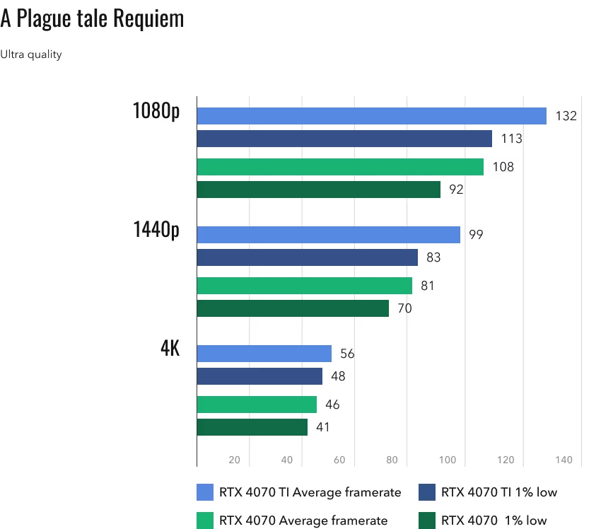 В игре A Plague Tale: Requiem обе видеокарты демонстрируют отличную производительность в 1080р и 2К, но при переходе к 4К комфортные 60 ФПС становятся недостижимы без использования DLSS. В более низких разрешениях оба видеоадаптера обеспечат комфортный геймплей. Разница между ними составляет около 22%.