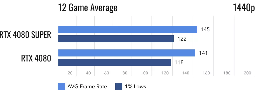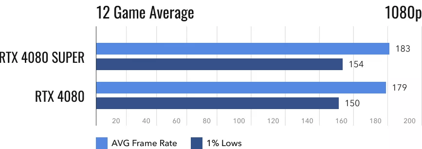 Тестирование RTX 4080 и RTX 4080 Super началось с запуска игр в разрешении FullHD. RTX 4080 Super в среднем оказалась на 2% производительнее обычной RTX 4080 и её усредненный результат по 12 играм составил 183 FPS.