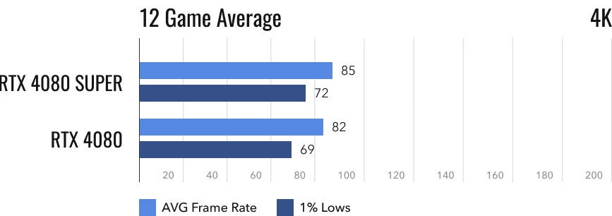 Похожее преимущество наблюдается у обновленного видеоадаптера и при переключении на 4K. Без активации RT-ядер RTX 4080 и RTX 4080 Super выдают в среднем 82 и 85 FPS — разница составляет 3,7%. Это по испытаниям во всё тех же 12-играх, включающих в себя Alan Wake 2, Cyberpunk 2077, The Last of Us Part 1 и многие другие современные хиты.
