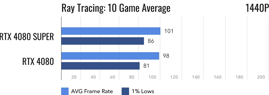 Активация рейтрейсинга отрицательно сказывается на производительности видеокарт. Эти функции были протестированы в 2K-разрешении. RTX 4080 Super выдаёт в десяти поддерживаемых трассировку лучей играх в среднем 101 FPS. Результат обычной RTX 4080 — на 3% меньше.