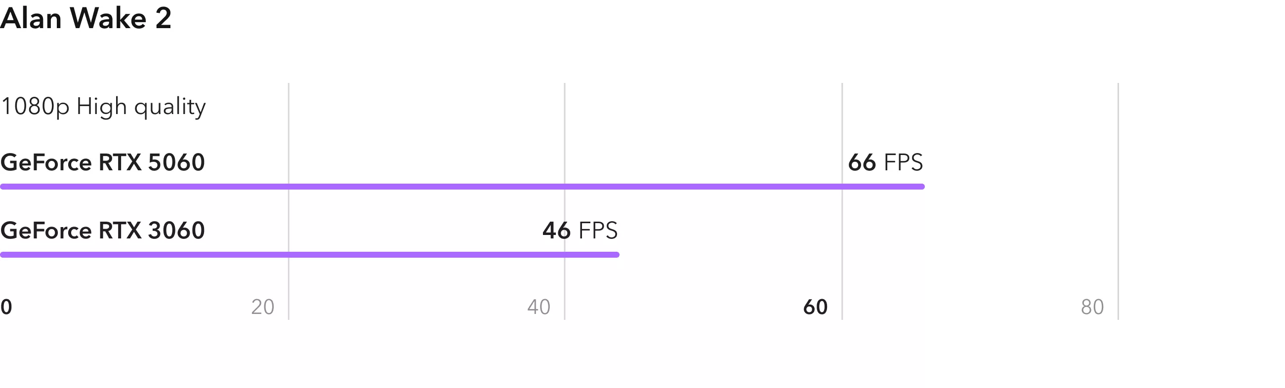 Игра Alan Wake 2 довольно требовательна к видеокарте, поэтому RTX 3060 даже в разрешении 1080p не способна выдать комфортный уровень FPS. RTX 5060, напротив, показывает плавные 66 кадров в секунду, вырываясь вперед на 40%.
