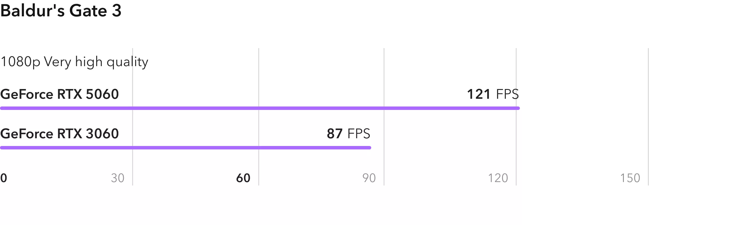 Baldurs Gate 3 – это одна из немногих современных игр, сочетающих хорошую графику и оптимизацию. Даже с видеокартой RTX 3060 можно выставить максимальные настройки и при этом получить более 80 FPS. RTX 5060 показывает уже более 120 кадров в секунду, что подойдет для высокогерцового монитора или повышения разрешения до 2К.