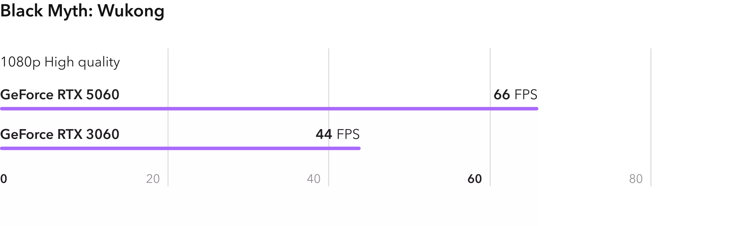 Black Myth: Wukong является примером того, как надо работать с движком Unreal Engine 5. Окунуться в мир классики китайской литературы вместе с могучим воином-обезьяной можно с комфортными 66 FPS на RTX 5060. Новинка опережает RTX 3060 разу на 50%. Однако, с DLSS в режиме "Качество" вы получите 61 кадр в секунду на RTX 3060. Это говорит лишь о том, что запаса производительности старой карты едва хватает для запуска современных игр с включенным апскейлером.