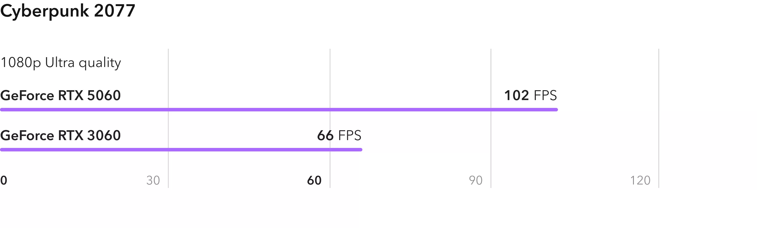На момент выпуска Cyberpunk 2077 не отличался хорошей оптимизацией, сейчас же RTX 3060 показывает больше 60 FPS на Ультра настройках. RTX 5060, в свою очередь, покажет более 100 FPS, а с таким показателем даже разрешение 2К не станет испытанием для карты.