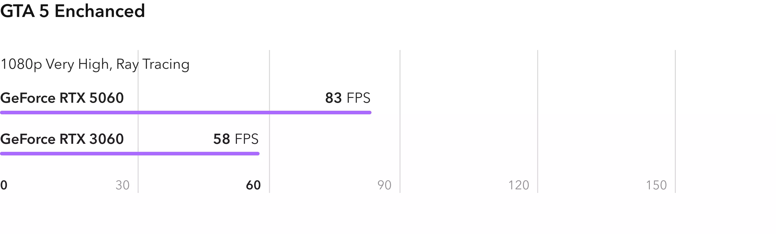 Обновленная версия GTA 5 получила поддержку трассировки лучей. Технология используется преимущественно для качественного затенения и не требует высоких вычислительных мощностей. RTX 3060 показывает комфортные 58 FPS. RTX 5060 более, чем на 40% быстрее, а с таким результатом можно поднять разрешение до 2К.