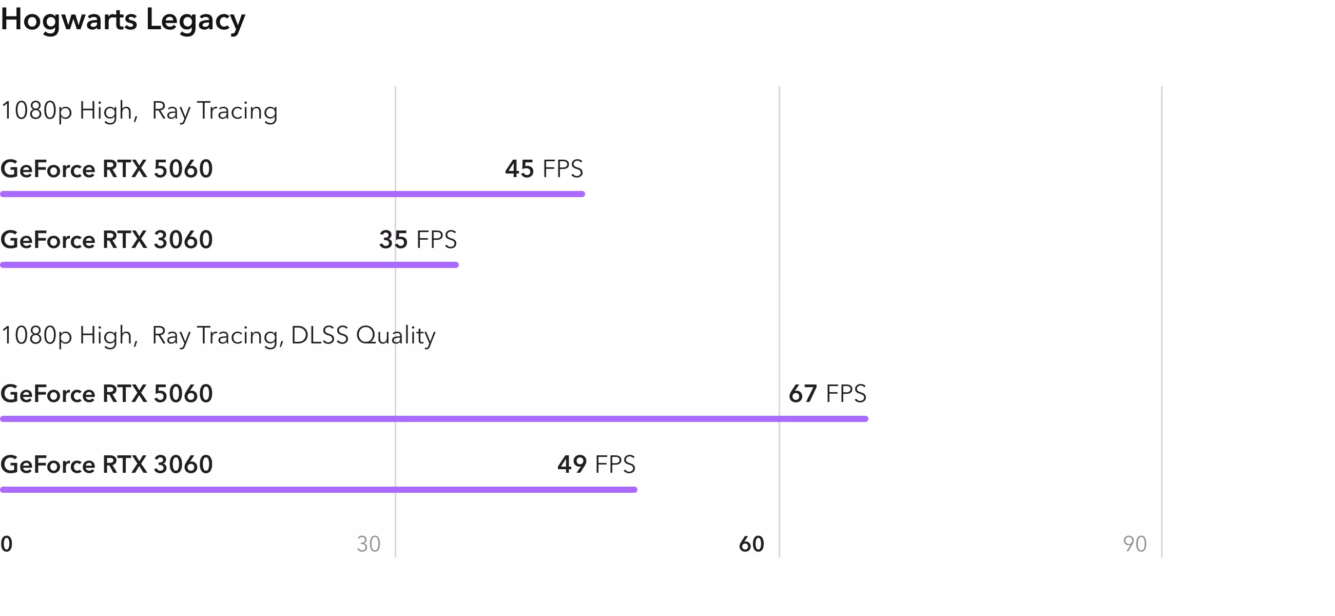 Hogwarts Legacy – одна из немногих игр, которая получает заметную прибавку в качестве картинки от включения трассировки. RTX 5060 показывает комфортные 67 FPS при включении DLSS. RTX 3060 выдаст менее 50 к/с, пройти игру получится, но геймплей будет не самым комфортным.