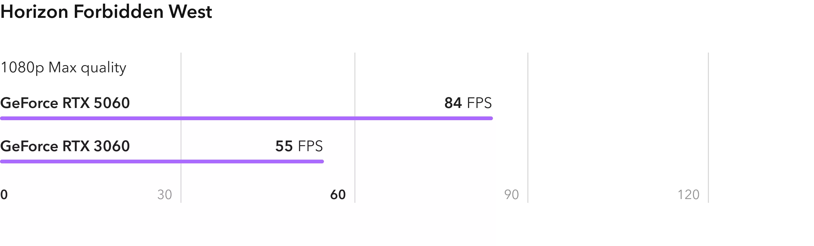 Порт Horizon Forbidden West, в отличие от ремастера первой части, имеет неплохую оптимизацию, но требует не менее 6 ГБ видеопамяти. Обе карты подходят под это требование. RTX 3060 показывает на максимальных настройках 55 FPS. RTX 5060 в полтора раза быстрее, что дает возможность поднять разрешение до 2К.