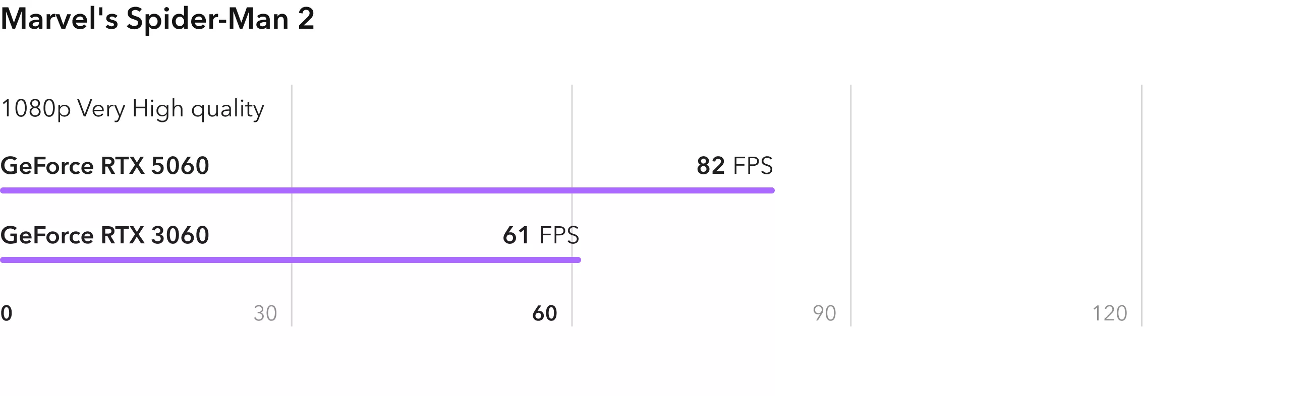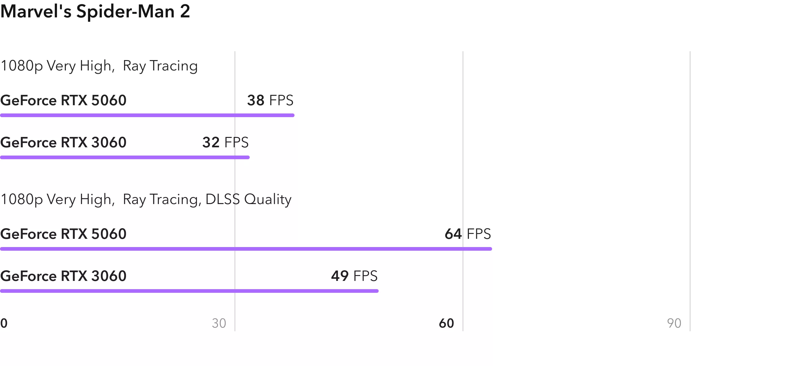 В Marvels Spider-Man 2 видеокарта RTX 3060 снижает свое отставание, так как с трассировкой потребление памяти превышает 10 ГБ. Но даже это не позволило вырваться в лидеры. При включенном апскейлере игра покажет в среднем 49 FPS. RTX 5060 в тех же условиях имеет уже больше 60 к/с, что позволит пройти игру с комфортом.