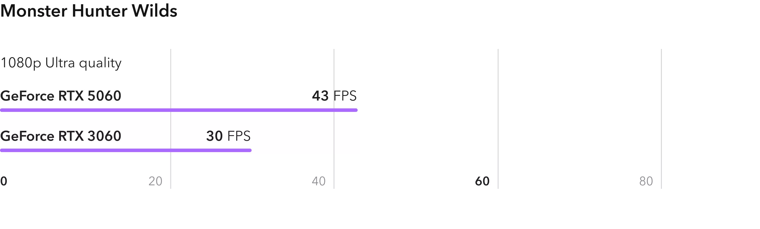 Игра Monster Hunter Wilds крайне требовательна к объему видеопамяти, однако, даже при таком условии RTX 3060 не проявляет своего преимущества в виде 12 ГБ видеопамяти. Средний FPS с этой картой составит лишь 30 к/с. RTX 5060 практически в полтора раза быстрее, а активация апскейлера позволит получить плавную картинку со средним значением в районе 60.