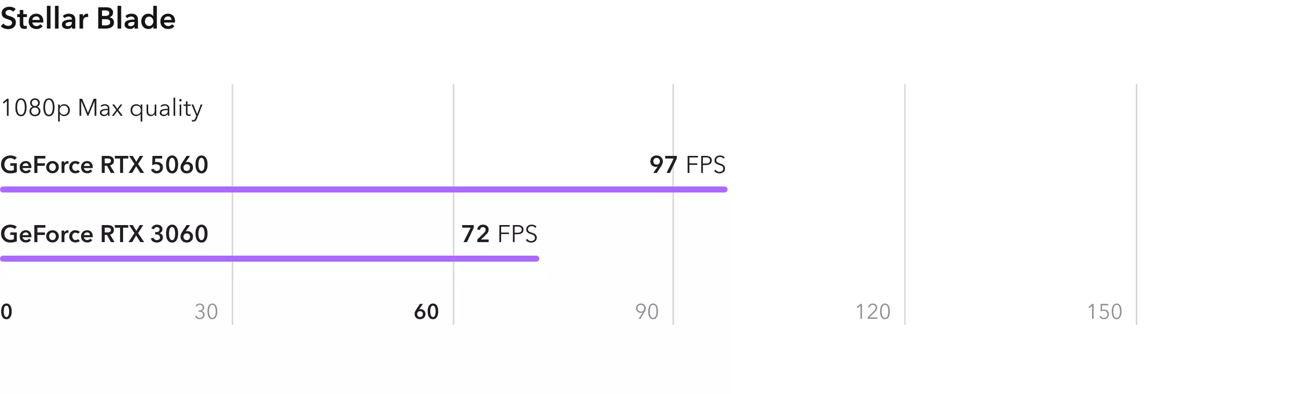Stellar Blade использует движок Unreal Engine 4, поэтому требования к компьютеру нельзя назвать высокими. RTX 3060 выводит в среднем 72 FPS, а RTX 5060 – 97. Во втором случае можно поднять разрешение до 2К.