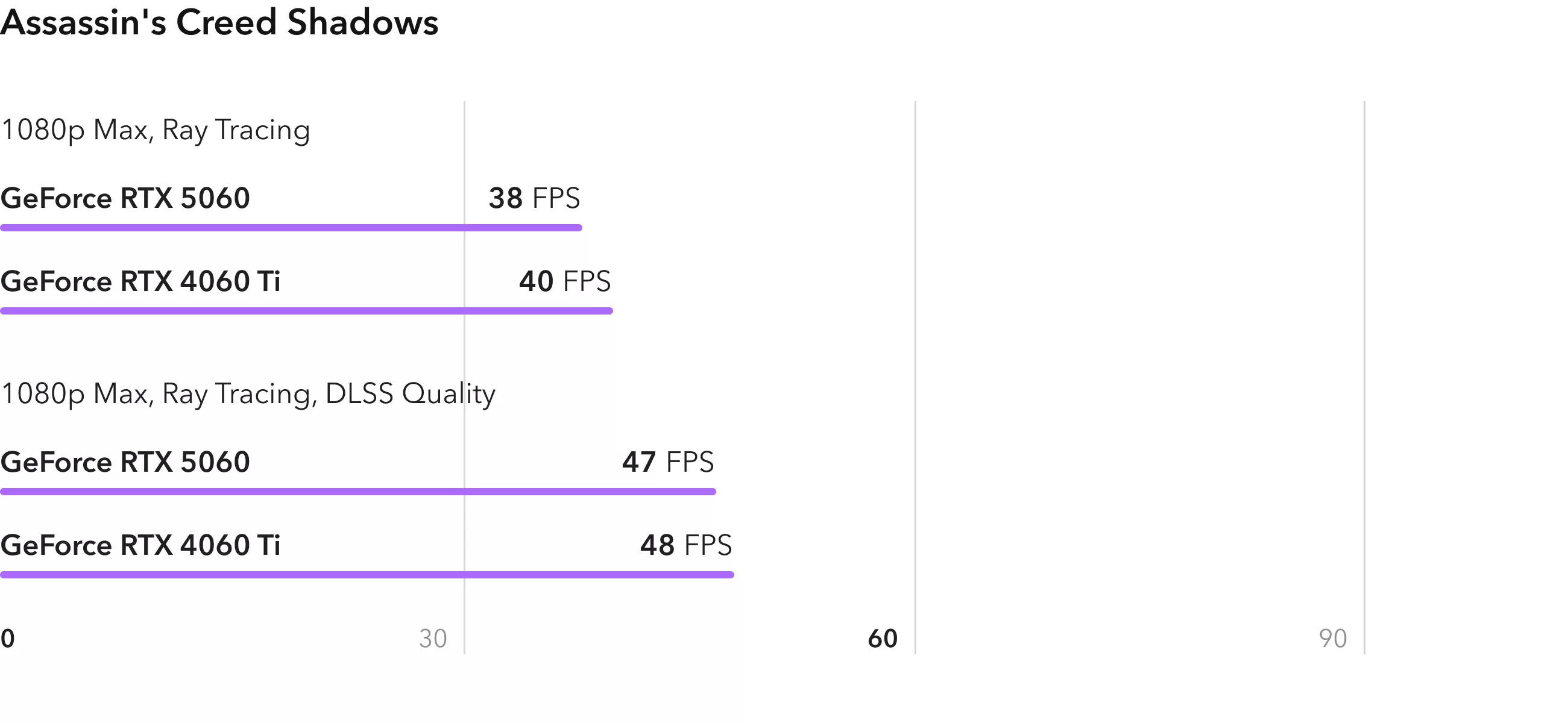 RTX 4060 Ti имеет преимущество в количестве вычислительных блоков и количестве RT ядер, поэтому показывает хороший результат в Assassins Creed Shadows. С DLSS можно рассчитывать на 48 FPS, а снижение нескольких настроек приблизит это значение к 60. RTX 5060 отстает незначительно, а с апскейлером практически сравнивается с RTX 4060 Ti, более продвинутые тензорные ядра работают немного эффективнее.