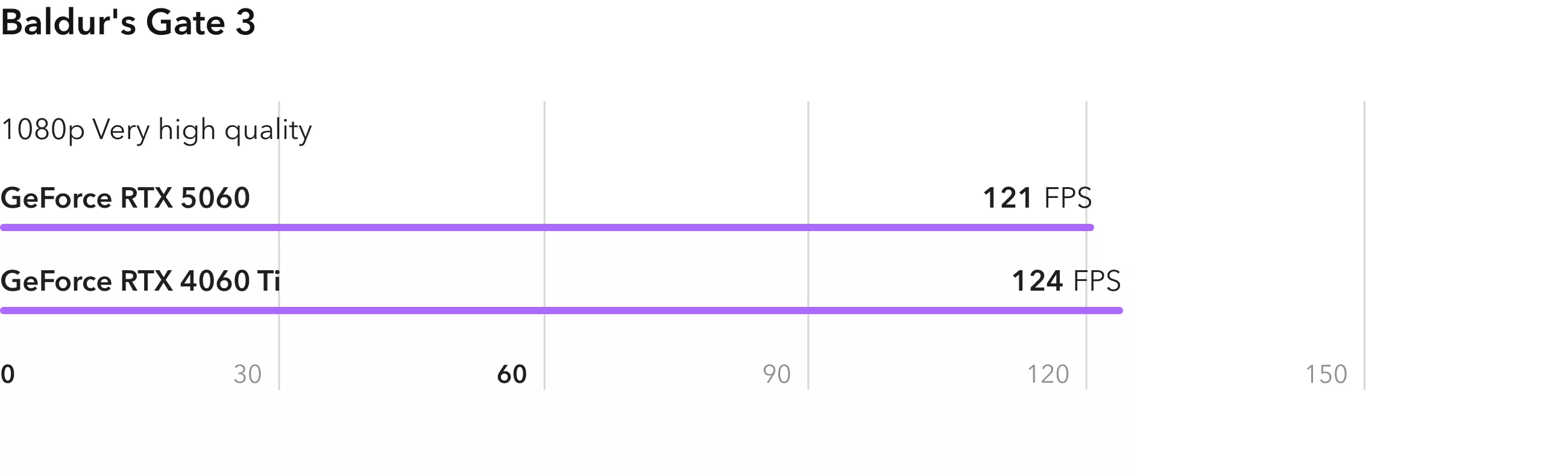 Увлекательное путешествие по миру Забытых королевств будет радовать вас отличной графикой на обеих видеокартах. RTX 5060 получила заметный прирост производительности за поколение и практически сравнялась с RTX 4060 Ti. Средний FPS карт превышает 120, как следствие, в этой игре можно повысить разрешение до 2К.