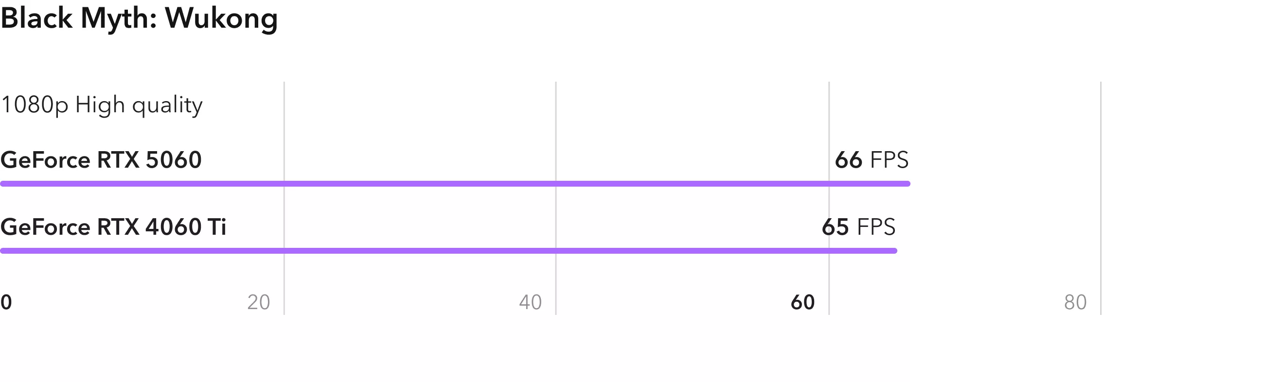Black Myth: Wokong на высоких настройках графики показывает 65 кадров в секунду на RTX 4060 Ti. RTX 5060 быстрее всего на 1 кадр, что сложно заметить даже с активным мониторингом.