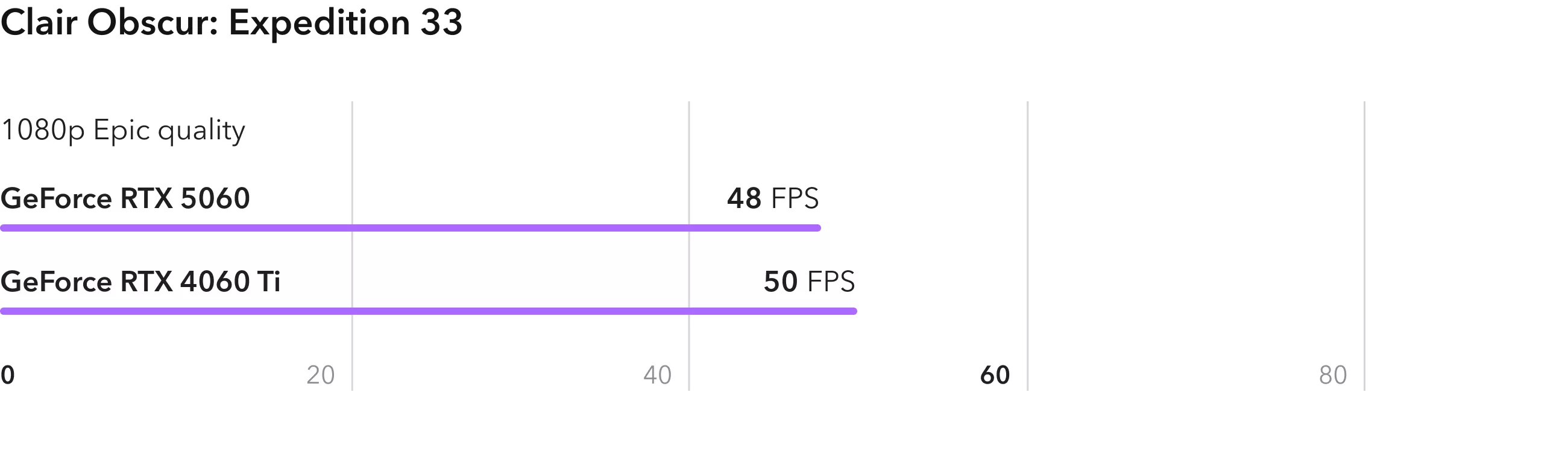 Новая ролевая игра с пошаговыми боями стала настоящим хитом среди геймеров. Владельцы RTX 4060 Ti могут рассчитывать на получение 50 FPS в разрешении 1080p с максимальными настройками графики. Тем, кто желает приобрести RTX 5060 следует ожидать практически идентичную производительность.