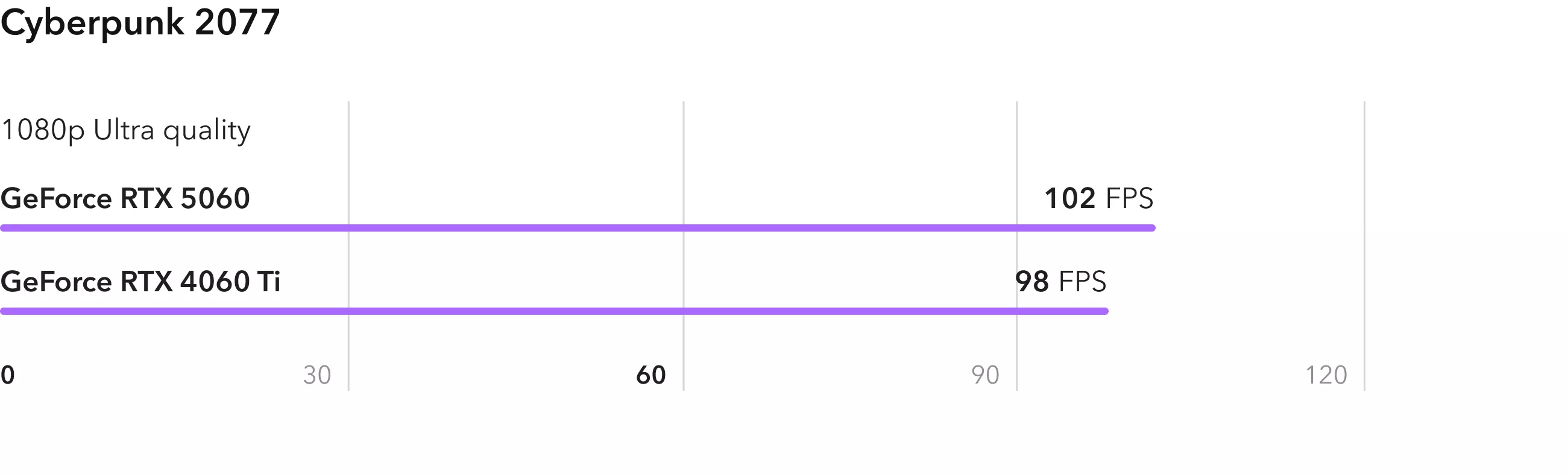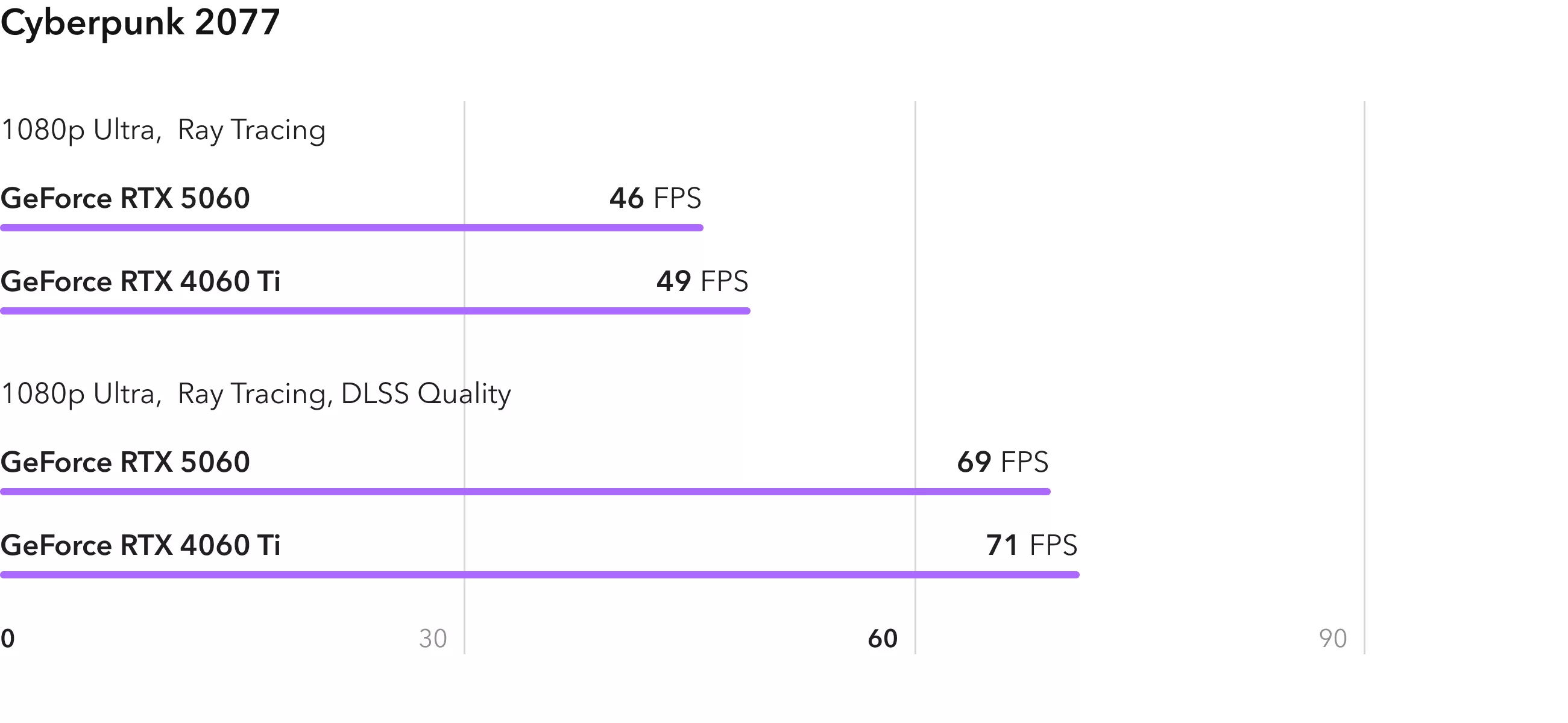 Ситуация повторяется и в Cyberpunk 2077. Несмотря на то, что по чистой производительности RT ядер у RTX 5060 заметное преимущество, реализовать его не получится, так как игра не учитывает архитектурные особенности новой линейки карт. Как итог, RTX 4060 Ti, имевшая отставание в режиме без трассировки, после ее активации вырывается вперед.