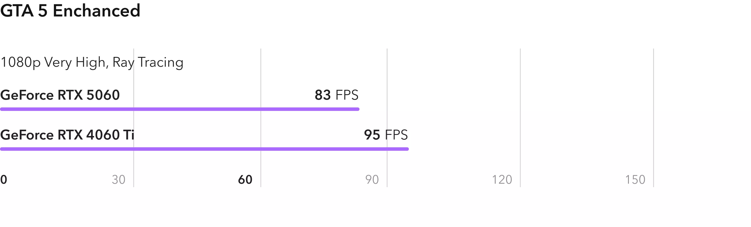 В улучшенной версии GTA 5 трассировка лучей заметно преображает картинку, а частота кадров падает не так сильно. RTX 5060 показывает отличный результат - 83 FPS, RTX 4060 Ti будет на 14% быстрее. С полученными результатами вы также можете перейти в 2К разрешение, попутно активировав DLSS.